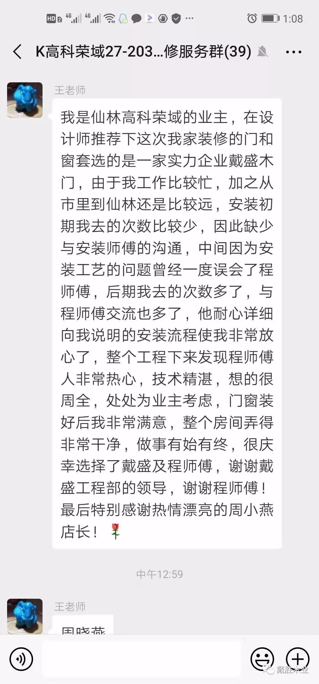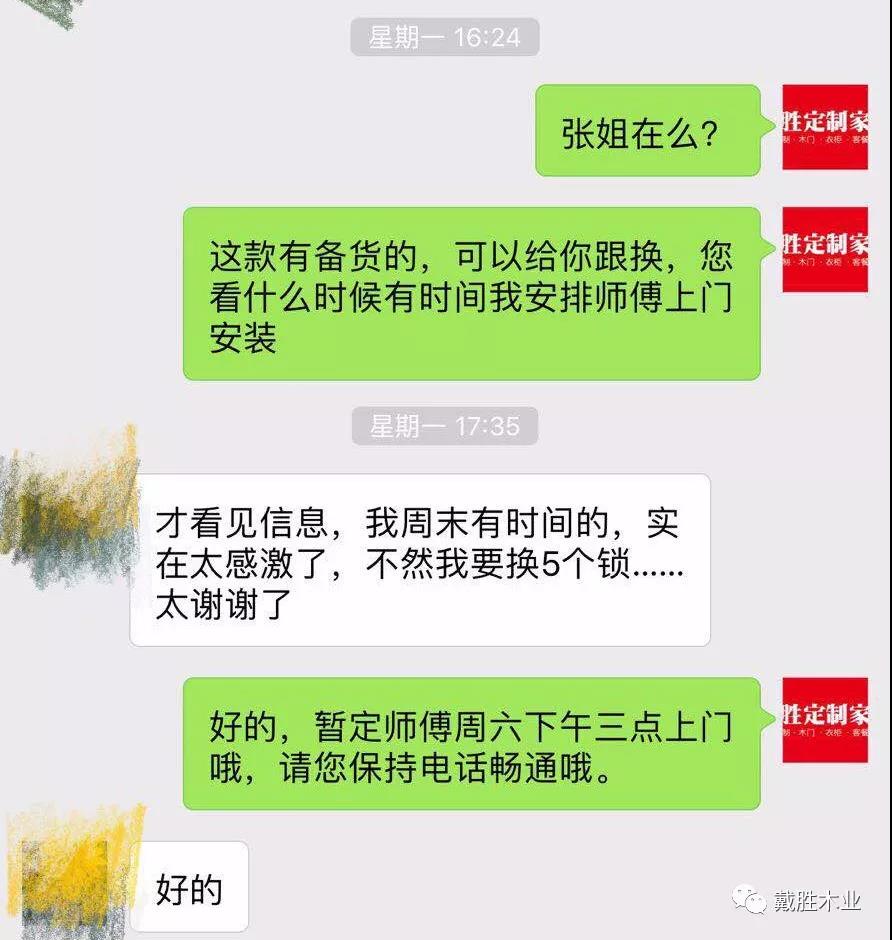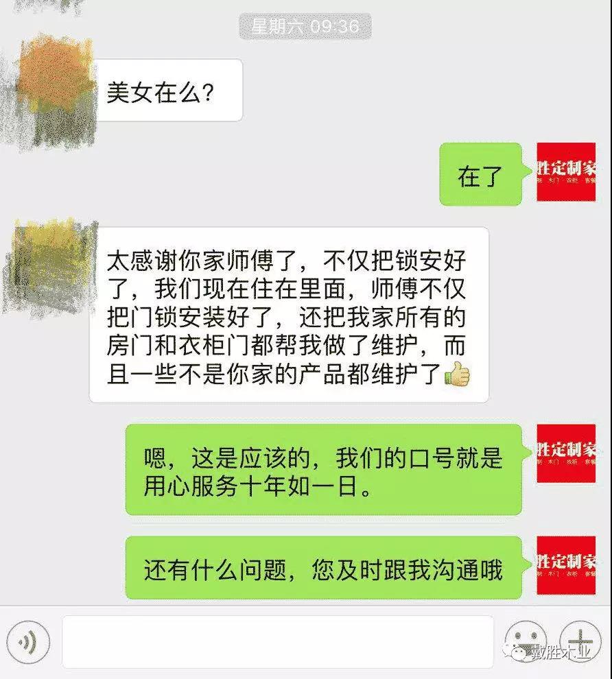 戴勝客服中心立刻安排“匠心服務(wù)團(tuán)”為客戶解決難題,不僅如此,更幫客戶把家中所有木門、柜門都進(jìn)行了維護(hù),得到客戶的高度評(píng)價(jià)。