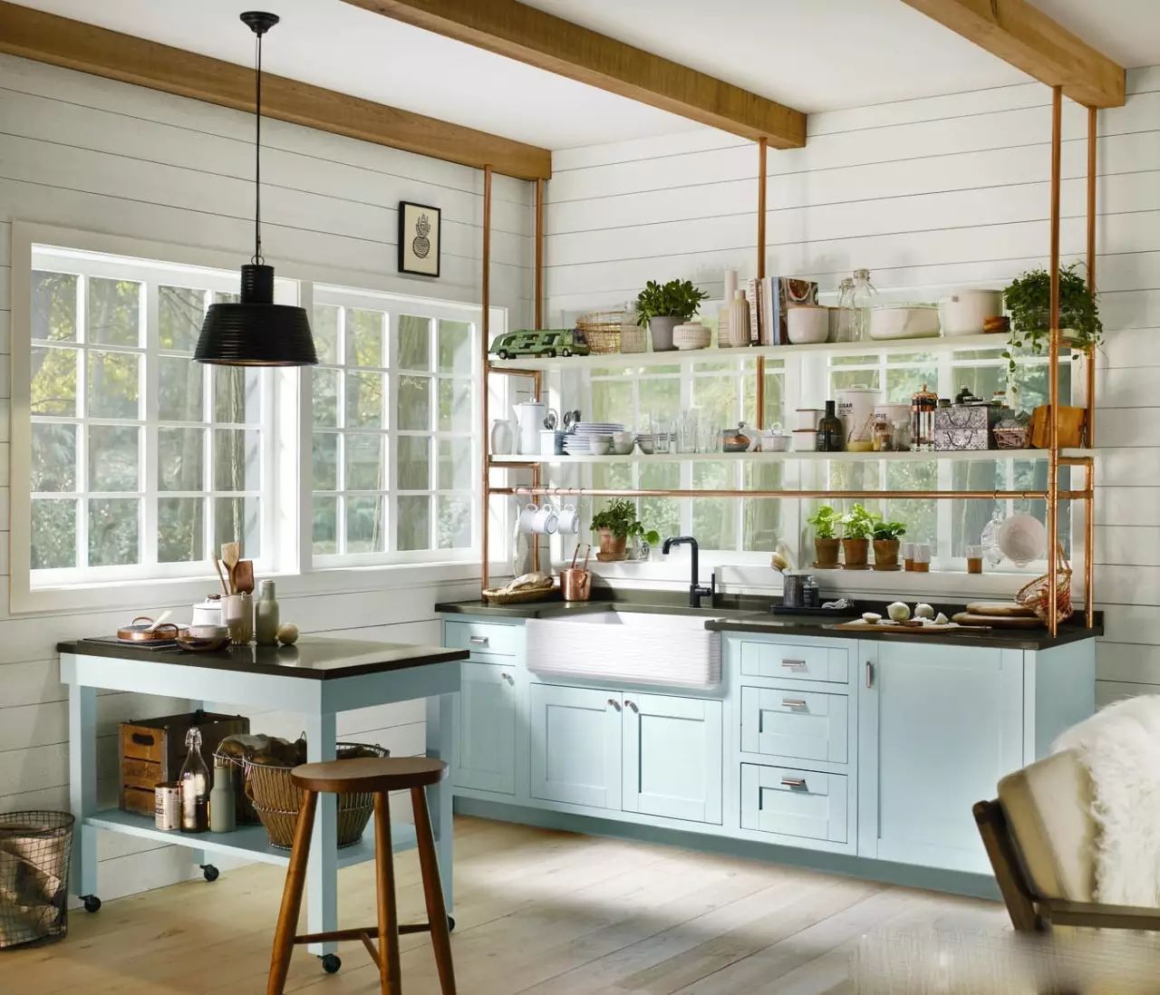 粉藍(lán)色的實木櫥柜搭配金屬工業(yè)管,這樣的搭配出奇的適合呢~