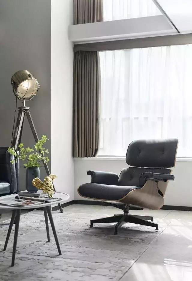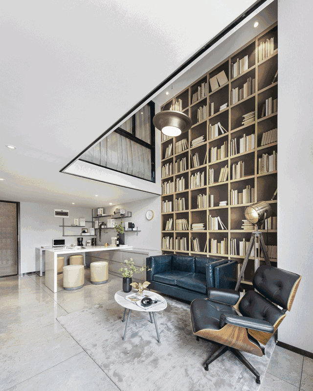 客廳挑高的背景墻使用書架壁紙裝飾,鈷藍(lán)色雙人沙發(fā)、黑色皮包躺椅、水紋精致大理石桌、仿古望遠(yuǎn)鏡造型的落地?zé)?,這些再日常不過(guò)的靜物、毫不鮮亮的色彩,在大面積自然光散射下,反而與外界的紛繁嘈雜隔絕開來(lái),顯得高雅精致,于靜謐中彌散出震撼無(wú)比的恒久物感。
