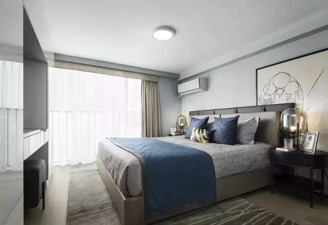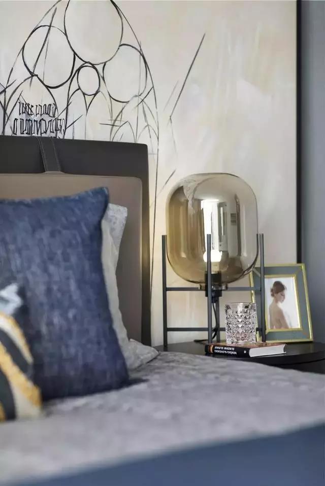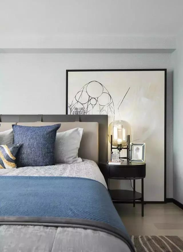 臥室依舊延續(xù)主色調(diào)的搭配,藍(lán)色系的幽靜高雅、灰色調(diào)的樸素恬淡,營(yíng)造遠(yuǎn)離喧囂的生活氛圍。
