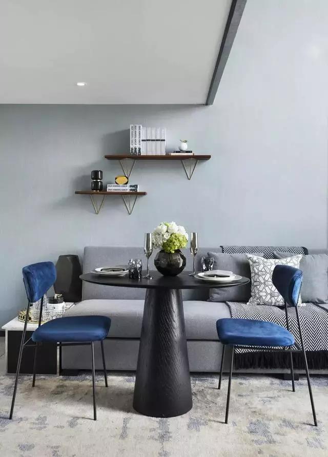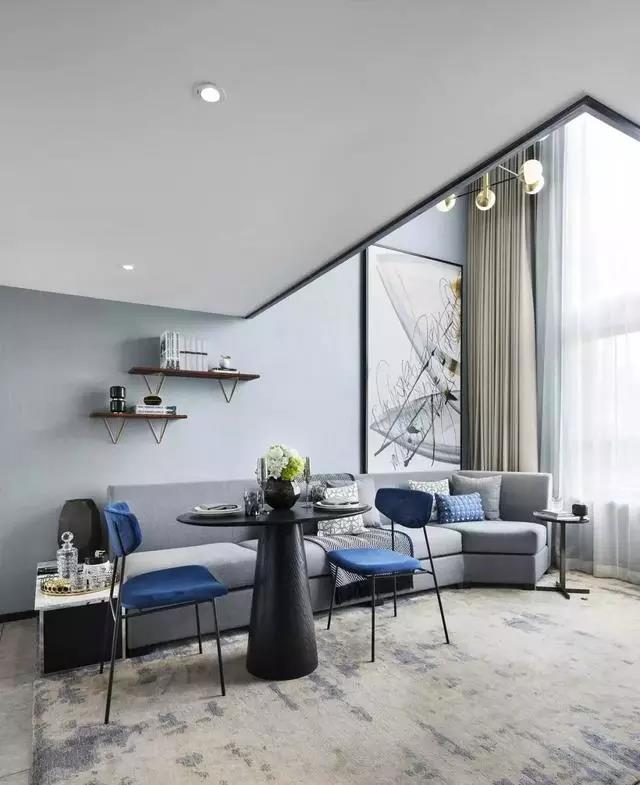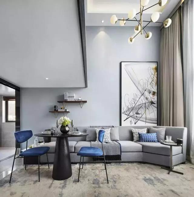 客餐廳拼合成一個(gè)大空間,兩層挑高的落地窗將陽(yáng)光引入,空間流動(dòng)著靜謐和諧的氣韻。亮藍(lán)色與高級(jí)灰家具完美搭配,后現(xiàn)代主義抽象藝術(shù)品、幾何線條的不凡魅力充斥在空間中,呈現(xiàn)一種至臻完美的生活情景。