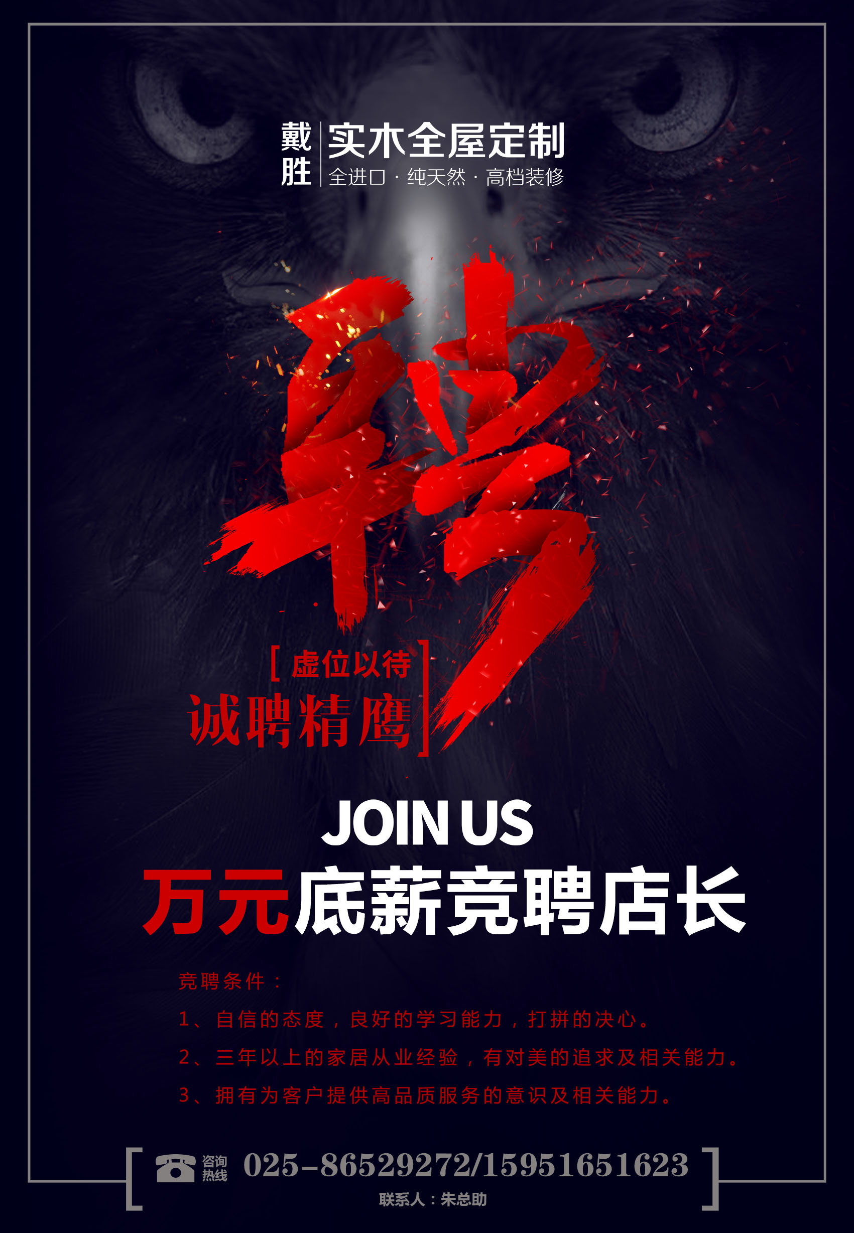 萬元底薪競(jìng)聘店長(zhǎng)啦! 戴勝實(shí)木全屋定制2018 為自己奮斗,才是最高效的制度。 良好的薪資收入是最好的競(jìng)爭(zhēng)力。 戴勝實(shí)木全屋定制品牌廣告火力全開。 一流產(chǎn)品,全進(jìn)口,純天然,高檔裝修。 一流服務(wù),售后團(tuán)隊(duì)配套十年穩(wěn)定如一日。 2018戴勝實(shí)木全屋定制全面啟動(dòng)。 南京公司十家直營(yíng)店面,業(yè)務(wù)目前排隊(duì)。 ...